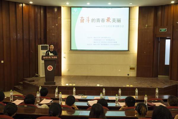 会议通过了《扬州大学广陵学院校友工作志愿者协会章程》,并由陈晓明院长和殷新春书记分别为院系校友工作志愿者协会授旗。随后由唐勇圣、陈学谦、陈兵三位校友分别作了主题为“奋斗的青春最美丽”的大学生村官报告。他们向在场的师生讲述了他们作为大学生村官奉献自我,投身基层农村工作的经历和心得。作为校友中一个闪亮的群体——大学生村官,他们奉献自我,投身基层,谱写了一篇篇美丽的人生华章。会上,总结了大学生村官联盟2013年工作,展望了2014年工作。
