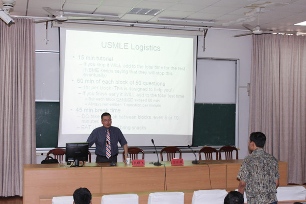 2014年9月3日,医学院2001届临床医学专业校友孔晓飞应邀回院,分别就医学研究生如何开展Bio-Medical Research 和How Did I Prepare for USMLE (我是如何准备美国执业医师资格考试)为全体研究生及2012级留学生作报告。