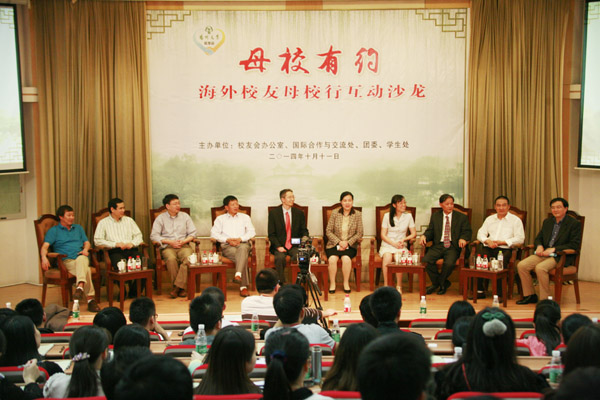 2014年10月11日下午,“母校有约——海外校友母校行”互动沙龙在荷花池校区逸夫图书馆报告厅举行。陈耀副校长出席并致辞。她代表全校师生对海外校友返回母校表示热烈的欢迎,对以北美校友分会会长李毅为代表的校友们为组织本次活动付出的辛勤劳动表示衷心感谢,希望同学们抓住与海外杰出校友近距离接触的机会,踊跃提问,使本次活动成为内涵丰富、形式活泼、坦诚真挚的互动交流活动。互动沙龙由校友会秘书长王庆林、旅游烹饪学院营养专业大四学生仓颉共同主持。