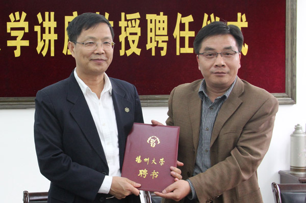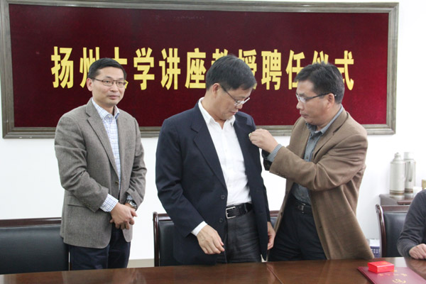 2014年10月16日下午,扬州大学讲座教授聘任仪式在农学院会议室举行。黄建晔副校长出席聘任仪式并为受聘为我校讲座教授的张建华博士颁发聘书。张建华博士为我校农学1982届校友、香港中文大学农业生物技术国家重点实验室主任、博士生导师。黄建晔副校长还亲自为张建华校友佩戴了校友徽章。
