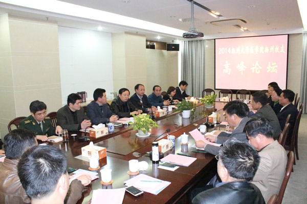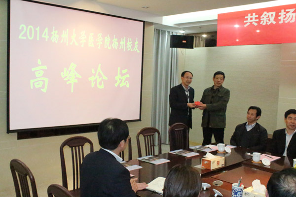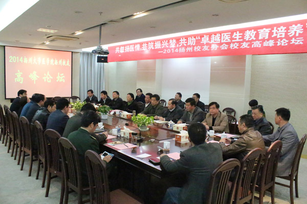 2014年11月21日下午,“共叙扬医情,共筑振兴梦,共助卓越医生教育培养――2014扬州大学医学院扬州校友高峰论坛”在江苏武警总队医院举行。校党委副书记、纪委书记刘延庆出席论坛并讲话。医学院扬州校友分会会长、副会长、常务理事共27名校友参加论坛。校友总会秘书长王庆林,医学院院长史宏灿、副院长龚卫娟、鞠永熙、王正兵等出席。论坛由医学院党委书记王炜主持。