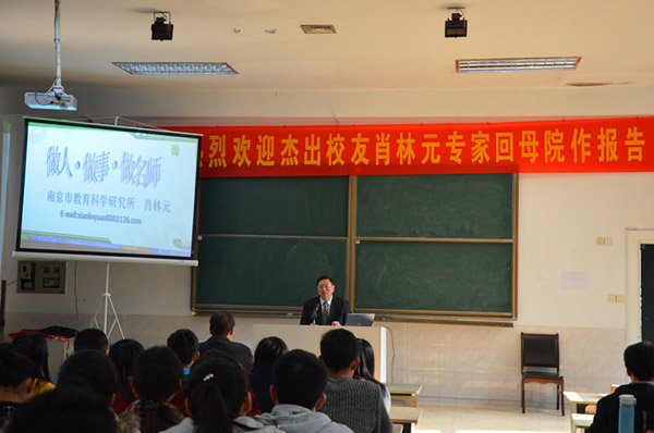 2014年11月21日,南京市教育科学研究所所长、全国特级教师、江苏省首批教授级高级教师,我校数学系1982届校友肖林元在瘦西湖校区文科楼为数学师范生做了一场关于“做人做事做名师”的报告。报告会上,肖林元校友幽默而又风趣的语言赢得阵阵掌声。