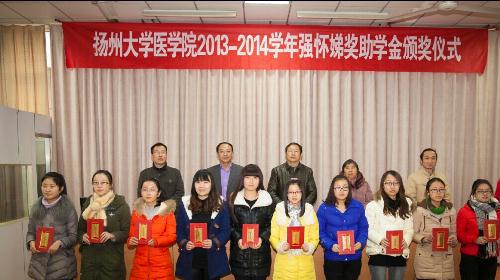 2015年1月5日下午3点半,在医学院报告厅,同学们用热烈的掌声拉开了2013——2014学年“扬州大学医学院强怀娣奖助学金”颁发仪式的帷幕。校党委副书记、纪委书记刘延庆,强怀娣奖助学金捐赠人叶小平校友的班主任强怀娣老师,校对外联络办公室主任、校友总会秘书长王庆林,医学院党委书记王炜、副书记陈轶群出席颁奖仪式。