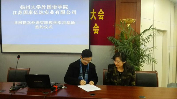 2014年12月30日,通过刘猛校友牵线搭桥,外国语学院与江苏国泰亿达实业有限公司签订了实践教学基地共建协议。