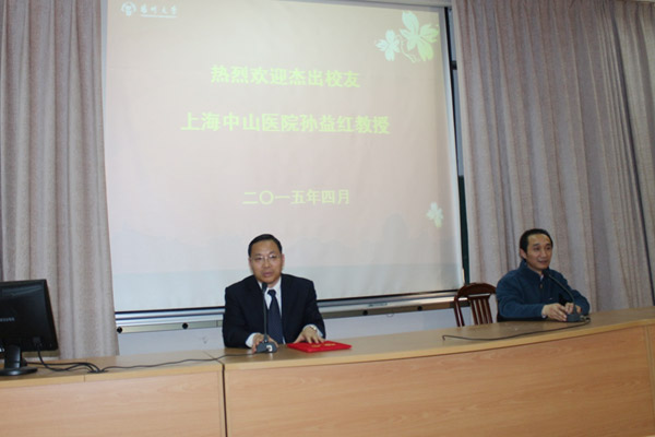 2015年4月24日下午,医学院1989届临床医学本科校友、上海中山医院普外科主任、医学院上海校友分会副会长孙益红教授应邀为医学生作报告。医学院院长史宏灿、党委副书记陈轶群、副院长鞠永熙出席,170余名师生参加报告会。报告会由医学院党委书记王炜主持。