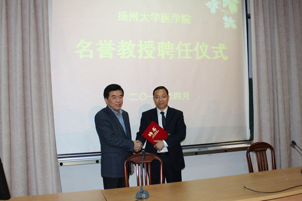 报告会举行前,医学院举行了聘任仪式,学院聘任孙益红校友为学院名誉教授。医学院史宏灿院长向孙益红教授颁发了聘书。聘任仪式上,孙益红教授表示受聘为母校的名誉教授是他的荣幸,同时也深感责任重大,今后将会更多的关注、关心和支持母校的人才培养和事业发展。