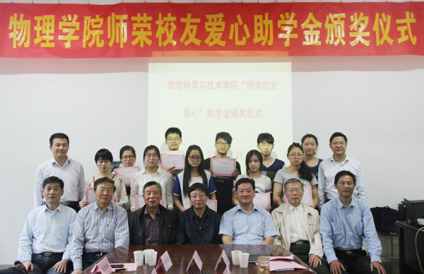 2015年5月21日下午,物理科学与技术学院2014-2015学年师荣校友爱心助学金颁奖仪式在物理楼会议室举行。校关工委常务副主任叶蕴珊、办公室主任刘方云,物理学院原党委书记沈秋林、物理系原系主任陈庆琉、物理系原系主任顾长华、院关工委副主任邓桂昌、院党委书记蔡中涛、院党委副书记王春雨,校对外联络办公室副主任刘红斌出席颁奖仪式。