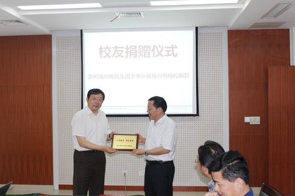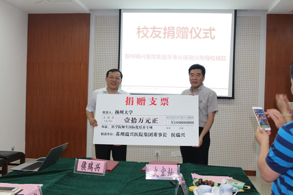 论坛期间,举行了侯瑞兴校友向母校捐资助学仪式。侯瑞兴校友与史宏灿院长共同签订了捐资助学协议,苏州瑞兴医院集团向扬州大学教育发展基金会捐赠10万元,设立医学院师生国际化培养专项。刘延庆向侯瑞兴校友颁发了纪念奖牌,王庆林向侯瑞兴校友颁发了捐赠荣誉证书。