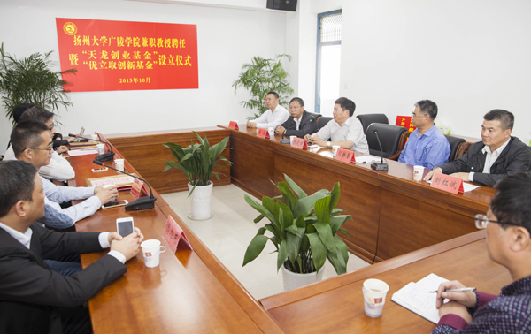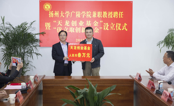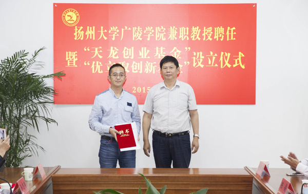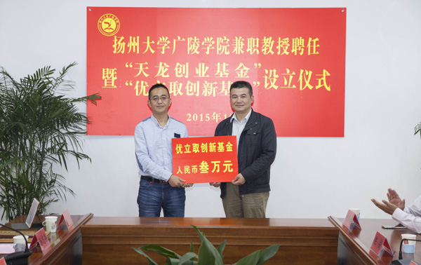 2015年10月21日,广陵学院举行兼职教授聘任暨“天龙创业基金”“优立取创新基金”设立仪式,扬州天龙职业培训学校校长汤志荣先生、上海优立取人力资源管理咨询有限公司总经理李文一先生受聘为广陵学院兼职教授。学院希望通过兼职教授的聘任工作,加强与行业、企业的交流、联系与合作,践行应用型人才培养的办学理念,把企业引入课堂、把课堂设在企业,进一步提升学院人才培养质量。