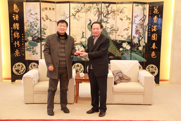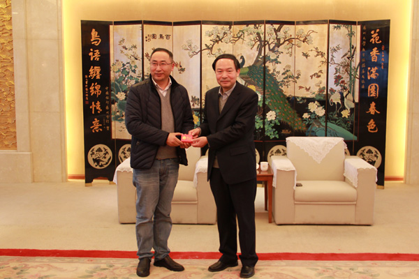 2015年12月12日,焦新安校长在行政楼二楼接待大厅亲切会见湖北恩施州副州长、我校园艺专业本科1986届、果树专业硕士研究生1989届校友程水源一行,并赠送校友徽章。