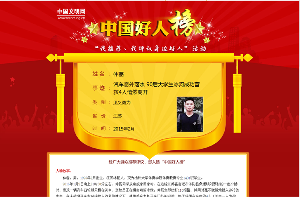2015年元旦期间,仲磊从亲戚家回家时,在途经宿迁市沭阳县桑墟镇刘寨村的一座小桥时,发现一辆汽车四轮朝天翻在河中,驾驶员正在拼命鸣笛求救。仲磊立即拨打110报警,并同时毫不犹豫地跳入冰冷的水中,在未能砸开车窗玻璃救人的紧急情况下,他用手奋力扒开车门外的淤泥,终于将困在车中的4人(其中一人为孕妇)救了出来。接警民警赶到现场后,仲磊却悄然回家。这个消息后来被学院团委老师知晓,方得以宣传。他被表彰为“见义勇为好青年”、