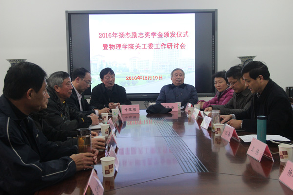2016年12月19日,物理科学与技术学院召开2016年扬杰励志奖学金颁发仪式暨物理学院关工委工作研讨会。出席本次会议的有梁隆圣老书记,校关工委常务副主任叶蕴珊,校友总会、基金会秘书长王庆林,校关工委办公室主任刘方云,院党委书记王春雨,院长曾祥华,院党委副书记周春开,副院长王伟,扬杰电子科技股份有限公司副总沈颖以及院关工委全体成员等。