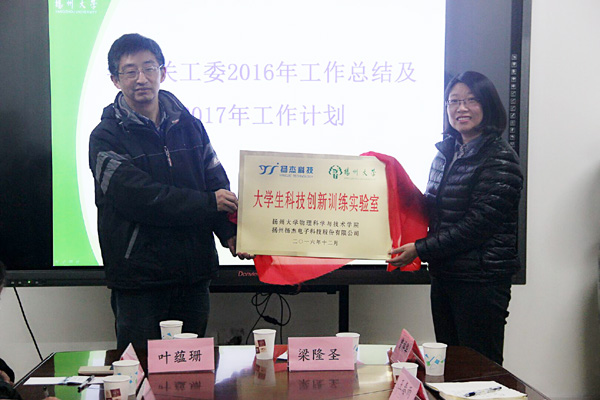 会上,王伟和沈颖共同为扬杰科技与物理学院共建的大学生科技创新训练实验室揭牌,并对物理学院关工委工作进行研讨。