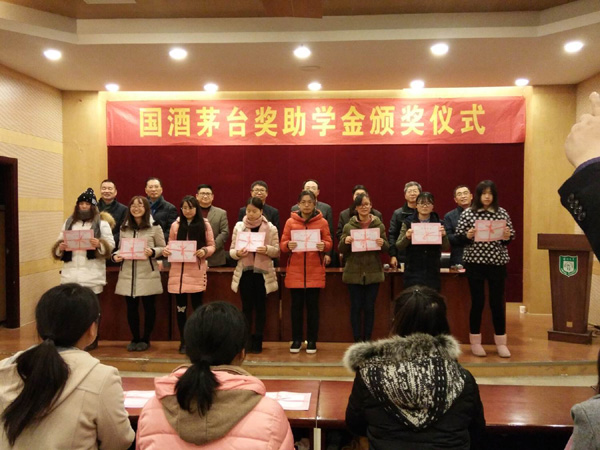 卢彪首先宣读获奖名单,随后获得茅台奖学金、助学金的同学代表上台领奖,电商1401班李聪同学作为获奖学生代表发言。