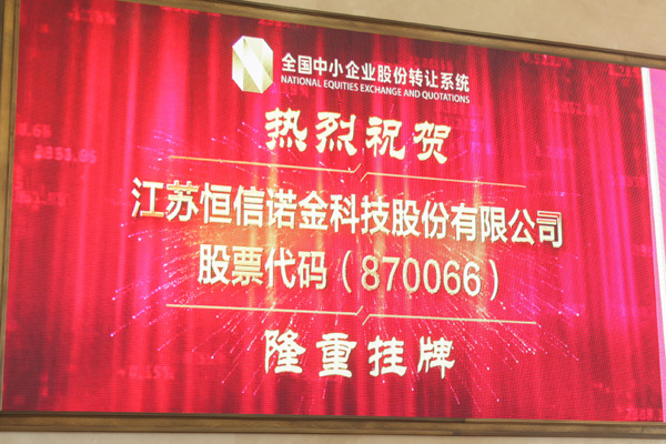2017年1月13日,江苏恒信诺金科技股份有限公司(证券简称:恒信诺金;证券代码:870066)正式挂牌全国中小企业股份转让系统(新三板)的敲钟仪式在北京隆重举行。江苏恒信诺金科技股份有限公司董事长朱延文校友出席盛会并敲响了恒信诺金挂牌新三板的钟声。