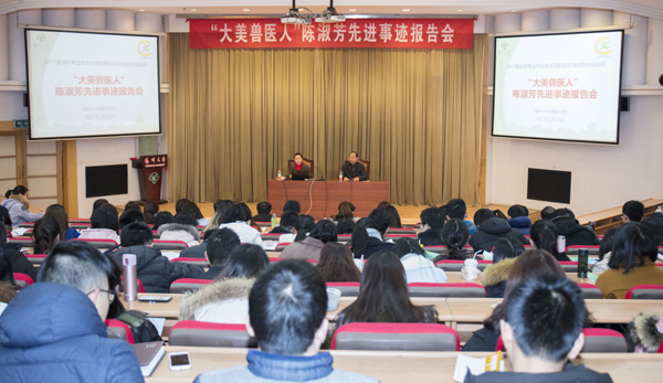 2017年2月24日,新学期伊始,兽医学院举行“大美兽医人”陈淑芳校友先进事迹报告会,浙江省象山县畜牧兽医总站站长陈淑芳校友应邀为2017届本科生和2016级全体研究生作报告。同学们通过报告会认真听取了陈淑芳校友无悔无怨扎根基层畜牧兽医一线30年的工作经历,认真学习她开拓创新、助农致富、无私奉献的感人精神。校友总会秘书长王庆林、兽医学院党委书记蔡丽娅出席报告会。报告会由兽医学院党委副书记张陟遥主持。