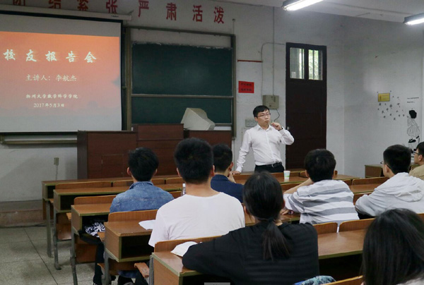 创业路上没有不可能!2017年5月3日,数学与应用数学(师范)专业2010届校友、数科院大学生创业指导老师李航杰应邀为数学科学学院学生作创业主题报告。李航杰校友通过分享他的大学生活、创业故事,与同学们交流了种种创业感悟,希望同学们从中得到启发。