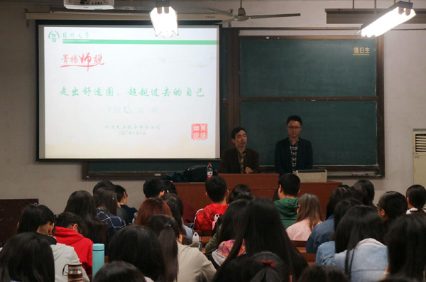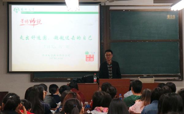 2017年5月8日,数学科学学院在文科楼214举办“菁扬师说”主题报告会,高翔校友应邀为学弟学妹作“走出舒适圈,超越过去的自己”主题报告,此次菁扬师说报告会吸引了16级14级师范专业本科生和部分研究生,共100多人。报告会由院党委副书记朱鑫铨主持。