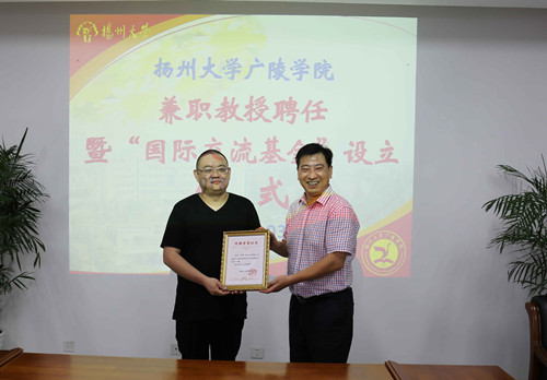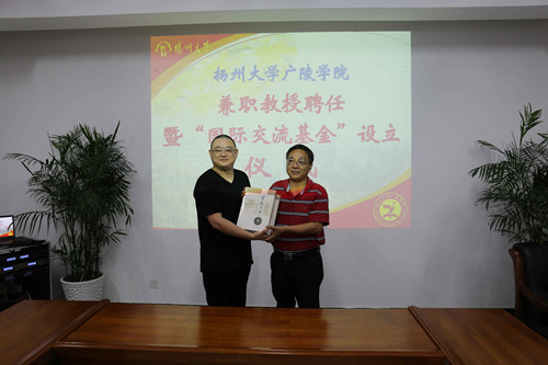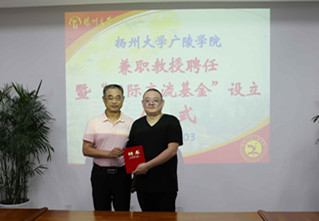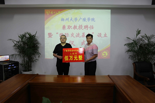 2017年7月3日,广陵学院兼职教授聘任暨“国际交流基金”设立仪式在江阳路南校区办公楼419会议室举行。中国清代江苏钱币研究会会长、苏局钱币博物馆馆长、中国钱币学会专家汪洋,校友总会、基金会副秘书长刘春秋,护理学院党委书记刘佩健,广陵学院院长殷新春、党委常务副书记孟益宏、调研员陈俊、院办主任张钟等出席仪式。仪式由孟益宏主持。