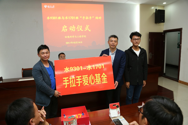 在结对共建活动的筹备阶段,水9301班校友决定通过众筹的方式设立“水9301—水1701手拉手爱心基金”。启动仪式上,举行了“水9301—水1701手拉手爱心基金”捐赠仪式,水9301班校友将在共建的四年中向母校捐赠4万元,用于资助水1701班家庭经济困难的学弟学妹以及支持班团活动。