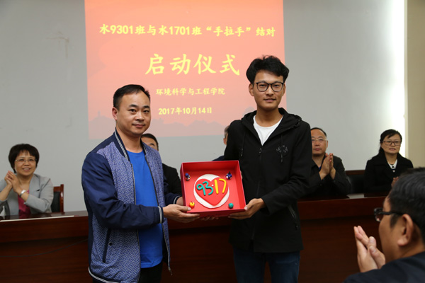 接着,举行结对启动仪式。在全场热烈的掌声中,水9301班校友代表潘小飞与水1701班学生代表袁超共同捧起由水1701班同学利用课余时间手工制作的标有“93”和“17”字样的心形粘土作品,标志着两个班级“手拉手”结对共建。何成达院长表示,此次结对仪式让他深深地感受到同系人之间跨越24年的情谊。