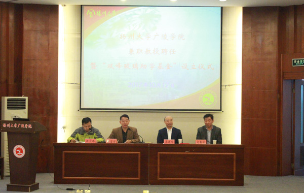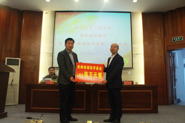 巢建峰校友向扬州大学教育发展基金会捐赠6万元,设立“广陵学院双峰玻璃助学基金”。孟益宏向巢建峰校友颁发兼职教授聘书,对巢建峰校友向母校捐资设立“双峰玻璃助学基金”表示感谢,要求广陵学院学子加强专业学习,提高实践能力,提升创业、就业能力,努力把自己打造成全面型的人才,同时要懂得感恩,回馈社会,并表示学院将发挥“双峰玻璃助学基金”的作用,助力学院科技教育事业。