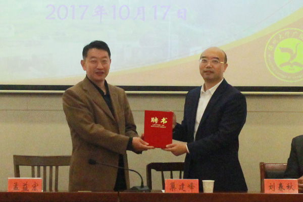 2017年10月17日,广陵学院兼职教授聘任暨“双峰玻璃助学基金”设立仪式在江阳路南校区办公楼一楼报告厅举行。我校食品科学与工程专业1996届校友、丹阳双峰玻璃有限公司总经理巢建峰,广陵学院党委常务副书记孟益宏、院学工办主任(团委书记)周宏伟,校友总会、基金会办公室负责人等出席仪式。仪式由周宏伟主持。