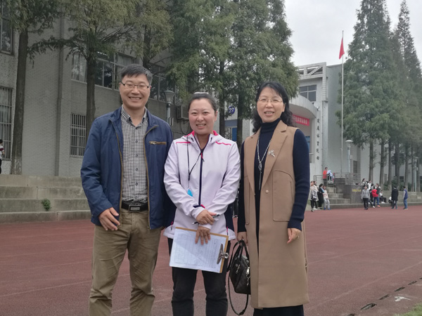 赴常州市金坛区第四中学走访体育教育专业1988级校友于小兵老师(左二)和体育教育专业1989级校友祁秀珍老师(右一)