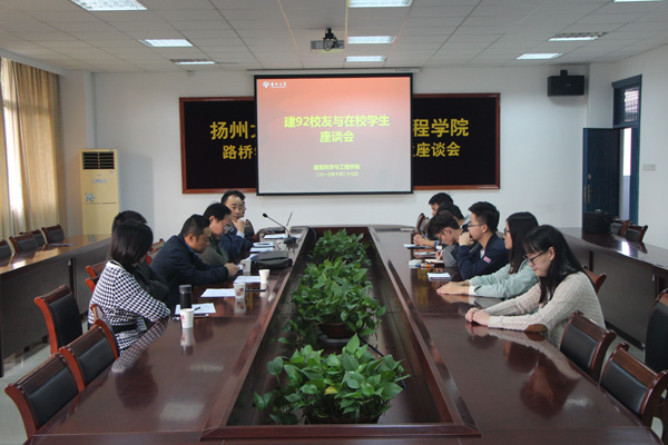 2017年10月27日下午,建92校友与“建92励志助学金”受助学生座谈会在建工学院202会议室举行。建筑科学与工程学院党委副书记王晖,朱峰等4名建92校友代表,教师代表胡凤庆、陶阳,院团委老师荣昆以及黄志维等6名“建92励志助学金”获得者参加了座谈会。