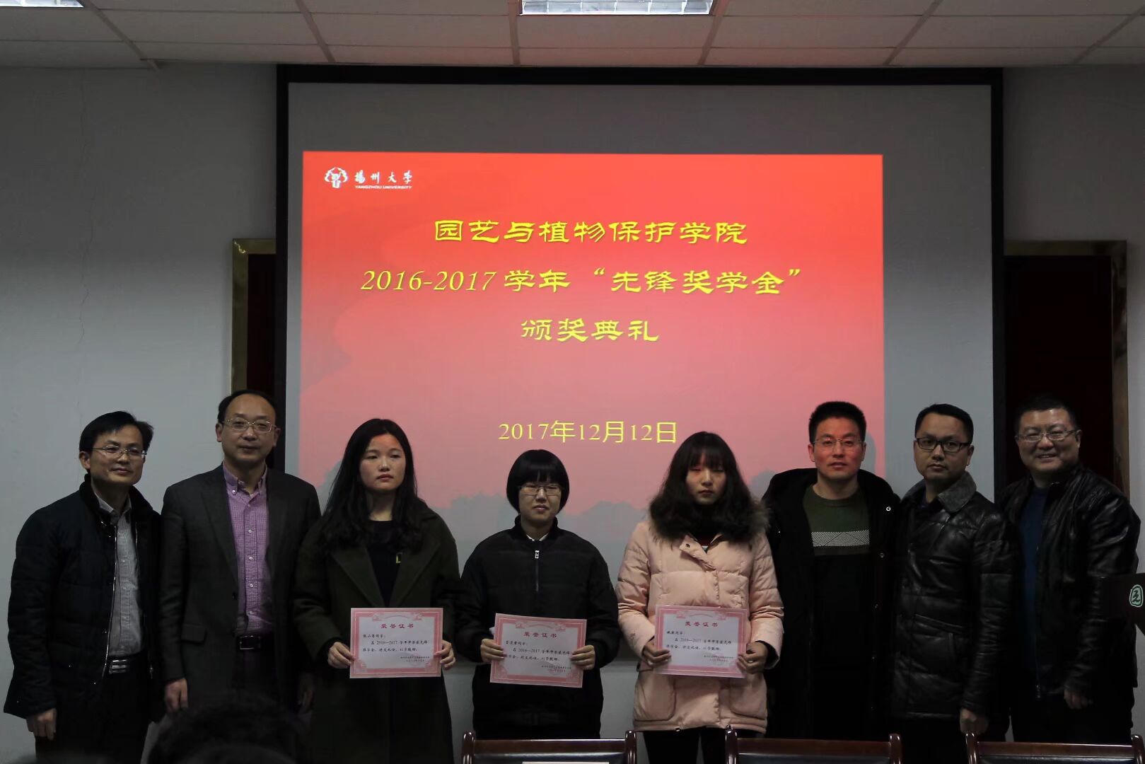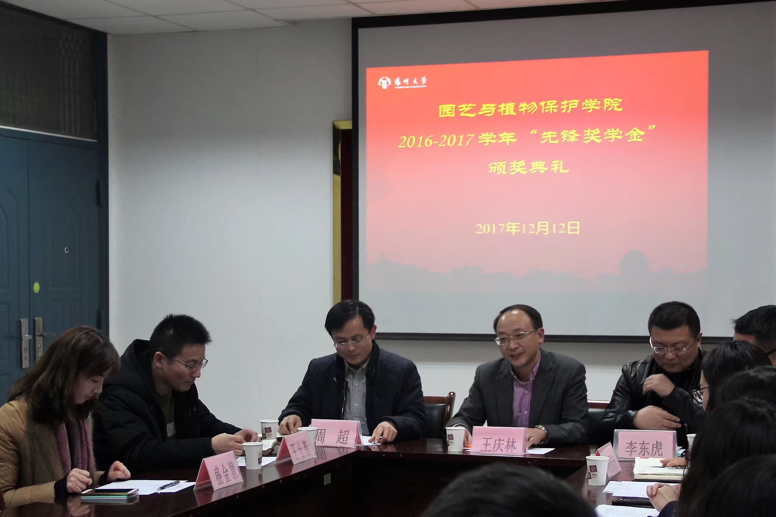 2017年12月12日下午,园艺与植物保护学院在文汇路校区10号楼107会议室举办2016-2017学年“先锋奖学金”颁奖仪式暨“我与导师共品下午茶”活动。扬州先锋化工有限公司副总经理李东虎先生、国际贸易总经理王士奎先生、行政助理盛金慧女士、校友总会、基金会秘书长王庆林、园艺与植物保护学院副院长杨国庆,团委陈晓老师及学生代表出席仪式。颁奖仪式由学院党委副书记周超主持。