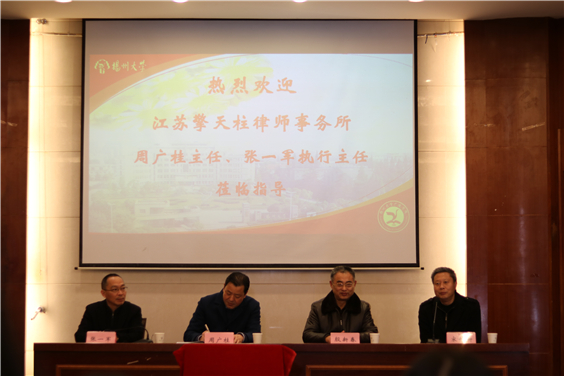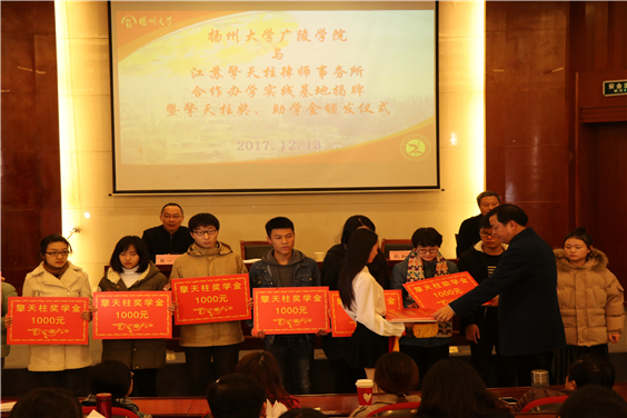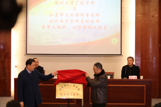 2017年12月13日下午,扬州大学广陵学院、江苏擎天柱律师事务所教学实习基地揭牌暨“擎天柱奖助学金”颁奖仪式在路南校区行政楼一楼报告厅举行。广陵学院院长殷新春,江苏擎天柱律师事务所主任周广桂、执行主任张一军,广陵学院文法系全体教师和全体法学专业学生参加此次活动。仪式由广陵学院副院长宋传新主持。