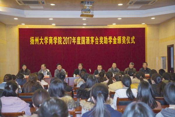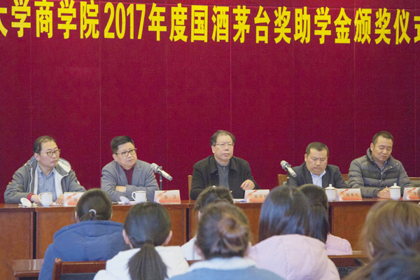 2018年1月12日下午,商学院2017年度国酒茅台奖助学金颁奖仪式在商学院行政楼报告厅举行。校党委书记姚冠新,国酒茅台营销有限公司江苏省区经理杨秀权,江苏中糖德和经贸有限公司董事长张卫校友、总经理李朝阳校友,扬州风正经贸有限公司总经理徐瑾校友,商学院党委书记谢科进,校友总会、基金会办公室负责人出席颁奖仪式。仪式由商学院党委副书记孙茂庆主持。