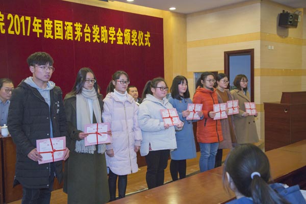 首先,谢科进宣读获得2017年度国酒茅台奖助学金学生名单,与会嘉宾分别为获得国酒茅台奖学金、特别助学金和助学金的学生代表颁发证书。工商1501班王玑玉同学作为学生代表发言,她向各位领导嘉宾以及在座的同学们汇报了一年来取得的成绩,表示要饮水思源、知恩图报,做一名有理想有担当的优秀大学生。