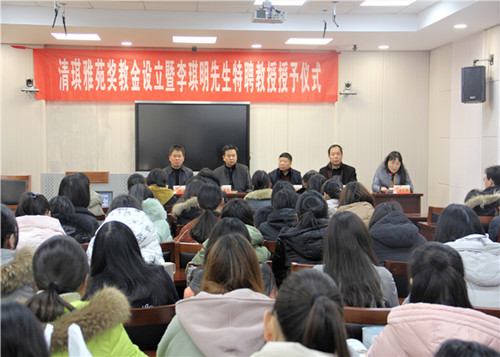 2018年1月3日下午,马克思主义学院在文汇路校区思想政治教育实践中心隆重举行“清琪雅苑奖教金”设立暨李琪明先生特聘教授授予仪式。马克思主义学院党委书记吴荣军、院长佘远富、副院长胡立法、各教研室主任、党支部书记等老师参加了此次活动。仪式由院党委副书记左红梅主持。