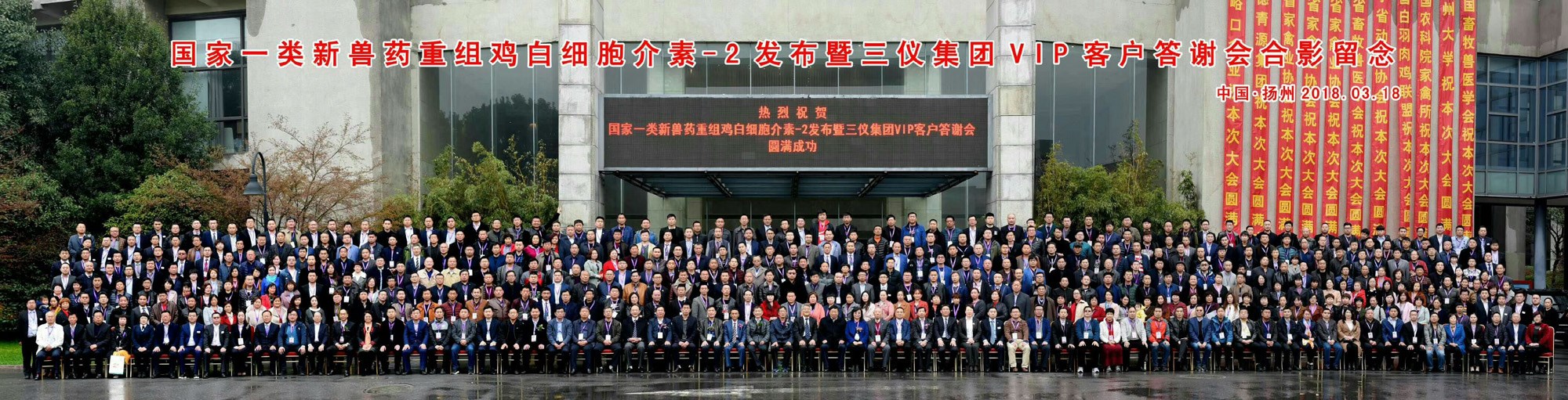 淮左名都,竹西佳处,烟花三月,骑鹤而来。2018年3月18日,三仪集团国家一类新兽药重组鸡白细胞介素-2发布暨三仪集团VIP客户答谢会在扬州会议中心隆重召开。中国畜牧兽医学会副理事长乔玉锋,扬州大学党委书记姚冠新,扬大基金会理事长、校友总会副会长、对外联络工作委员会常务副主任陈耀,扬州大学兽医学院刘秀梵院士,中科院亚热带研究所印遇龙院士,山东农业大学崔治中教授,华中农业大学金梅林教授,三仪集团董事会成员、科研团队、市场一线的高管成员、三仪合作伙伴等,共一千多人出席会议。