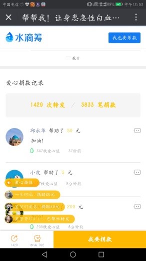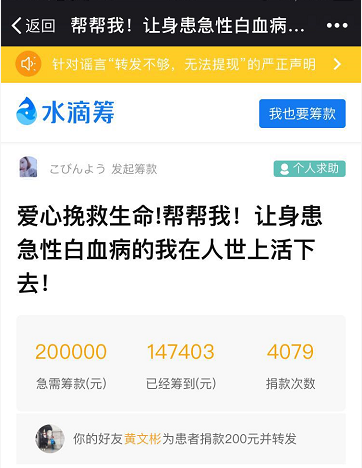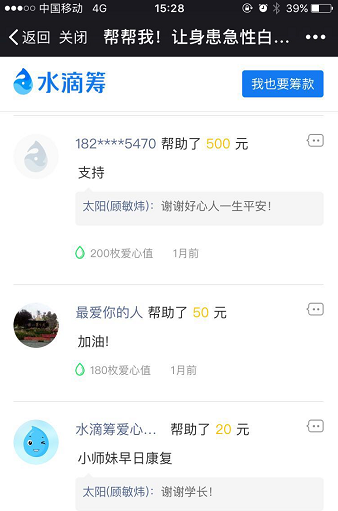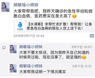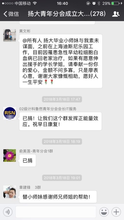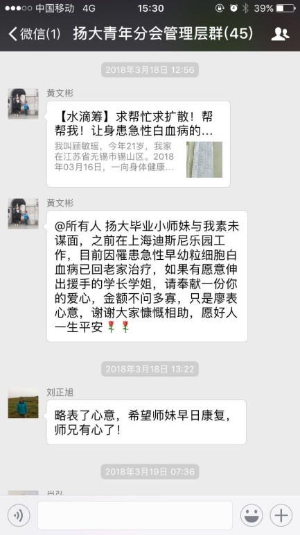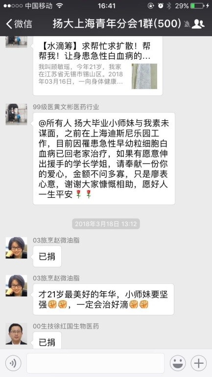 病魔无情,人间有爱。扬州大学上海校友会青年分会秘书长黄文彬了解到该情况后,立刻在校友微信群里发出倡议,帮助患病同学渡过难关。广大校友慷慨解囊,少的5元、10元,多得200元、500元,校友们纷纷捐款、转发,短短几天,累计转发1500次,捐款4000多笔,筹集善款近15万元,一股股爱心暖流涌向顾敏瑶同学,帮助她渡过难关。