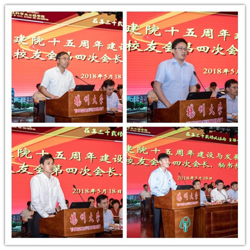 江苏扬建集团有限公司总经理邹厚存、院工程管理系副主任张兵、寇长江同学、单晨晨同学分别作为校友代表、教师代表、研究生代表和本科生代表发言。