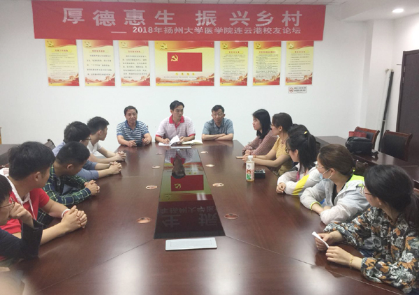 2018年6月16日下午,医学院连云港校友论坛在灌云县卫生进修学校举行,与会校友围绕“厚德惠生、振兴乡村”这一主题进行座谈交流。医学院副院长鞠永熙以及校友代表等12人出席论坛,论坛由院继续教育办公室主任张跃主持。