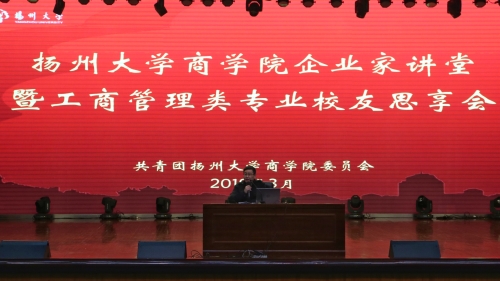 2019年3月10日上午,商学院企业家讲堂暨校友思享会于扬子津校区文体馆顺利举行。商学院邀请了爬山虎科技股份有限公司创始人兼CEO胡彦均校友、恒泰集团皖苏北区域董事长云商产业城副总裁刘娇校友、无锡市滨湖区税务局法制股副股长张希龙校友、商学院国际经济与贸易专业硕士生导师汤学良老师与同学们作专题分享。参与本次活动的还有扬州大学MBA教育中心主任连远强教授、原工商管理与人力资源管理系教学主任刘徳研老师、工商管理与人力资源管理系教研室刘宇伟老师及院团委老师。