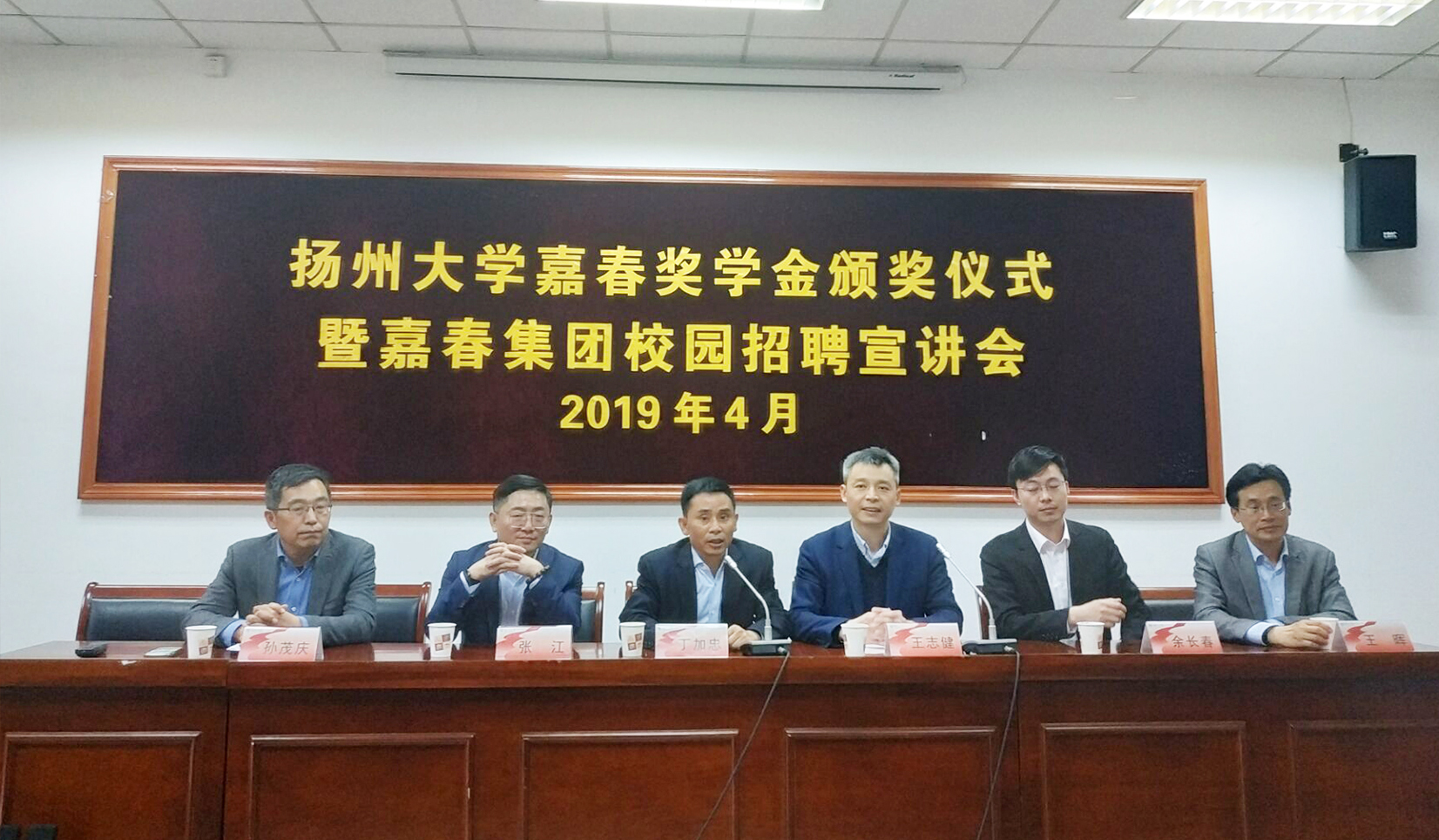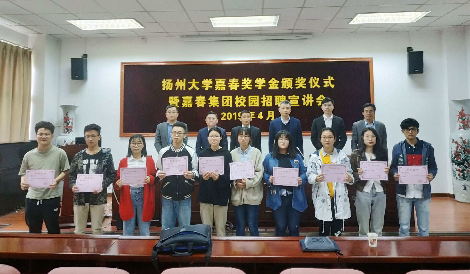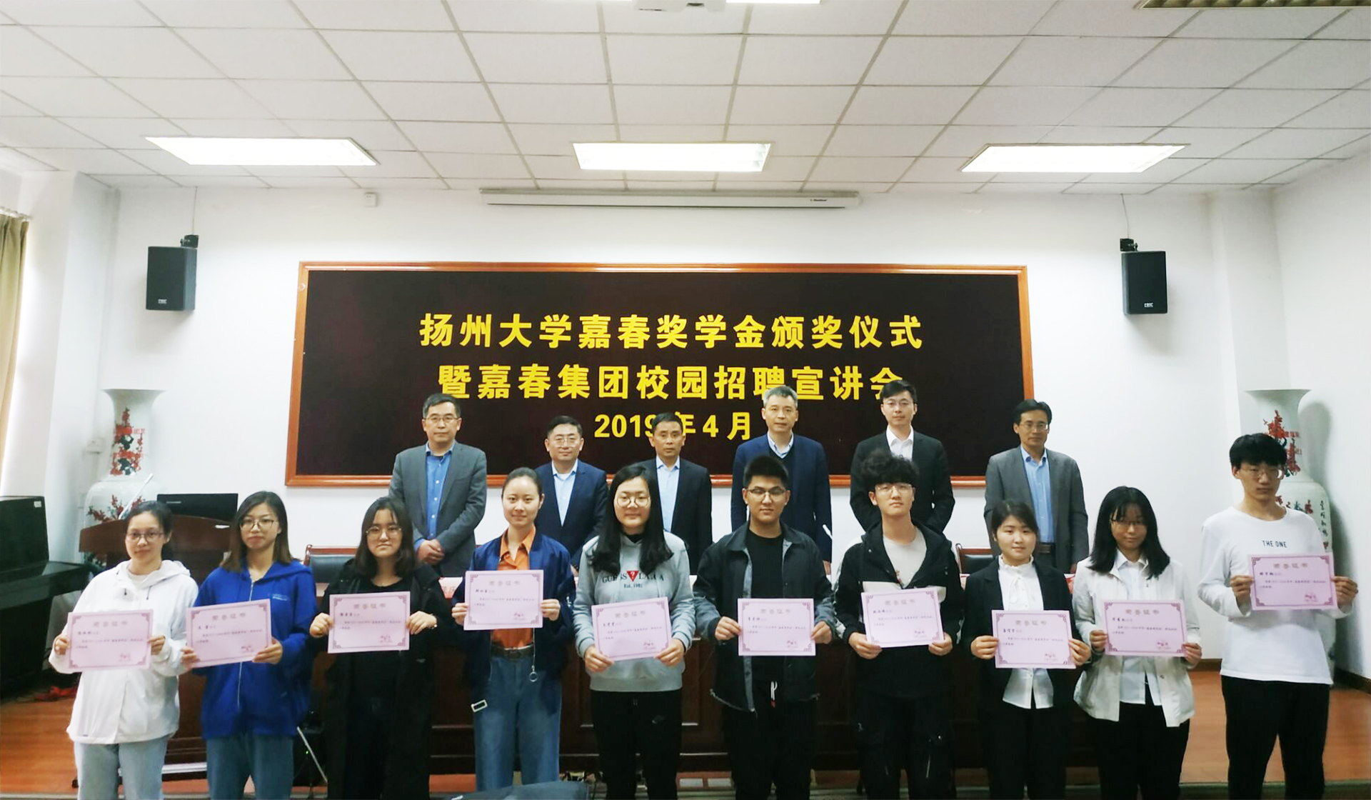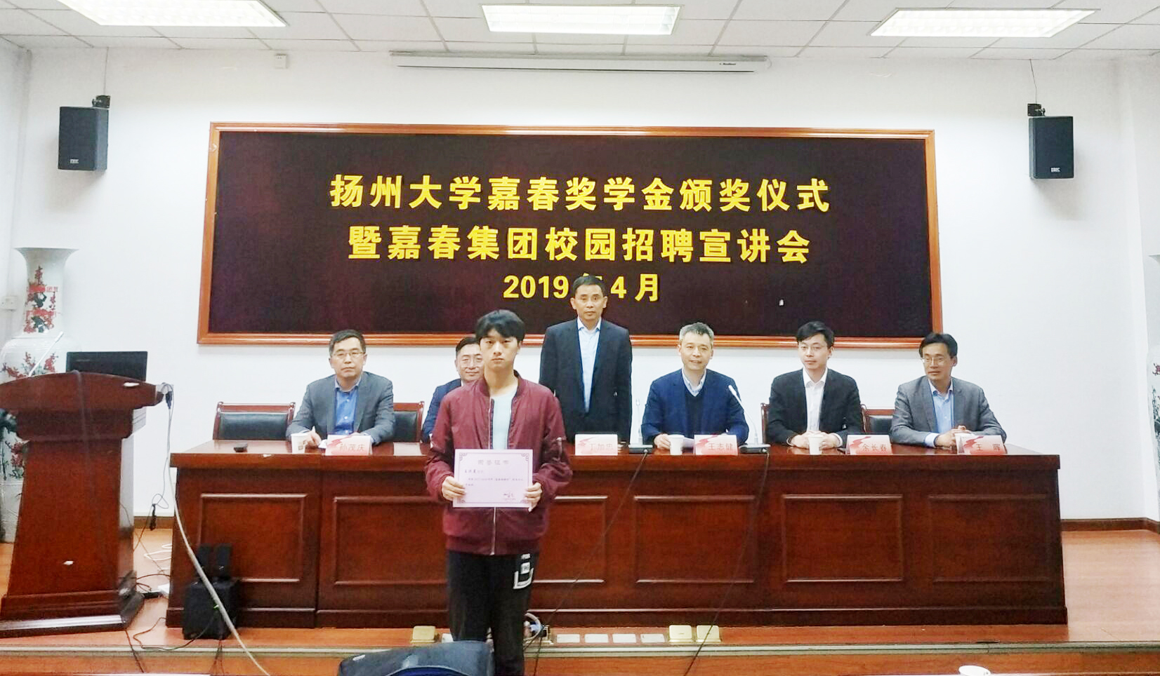 2019年4月23日,扬州大学“嘉春奖学金”“嘉春奖储金”颁奖仪式暨嘉春集团校园招聘宣讲会在建筑科学与工程学院102报告厅举行。嘉春集团扬州分公司总经理丁加忠、财务总监张江、人力资源部经理余长春,建筑科学与工程学院党委副书记王晖,商学院党委副书记孙茂庆,广陵学院办公室张建国老师等出席活动。颁奖仪式由校对外联络办公室副主任,校友总会、基金会副秘书长王志健主持。