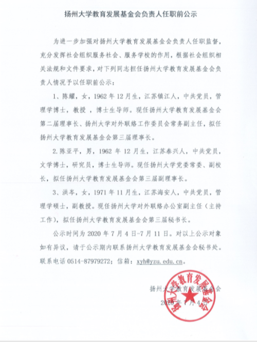 扬州大学教育发展基金会负责人任职前公示