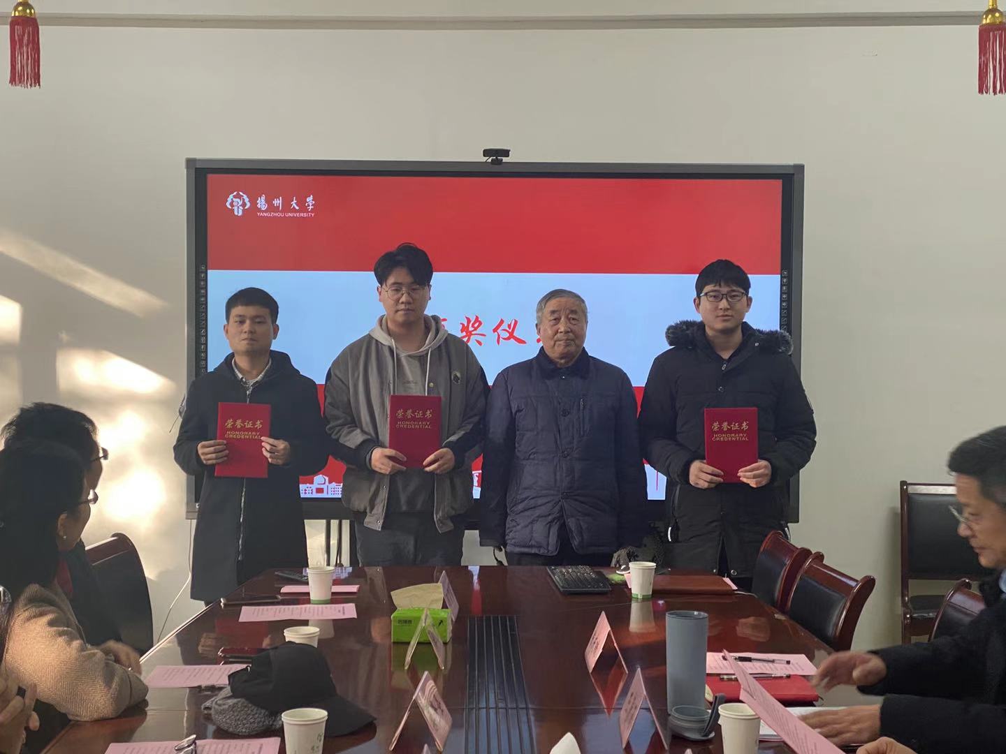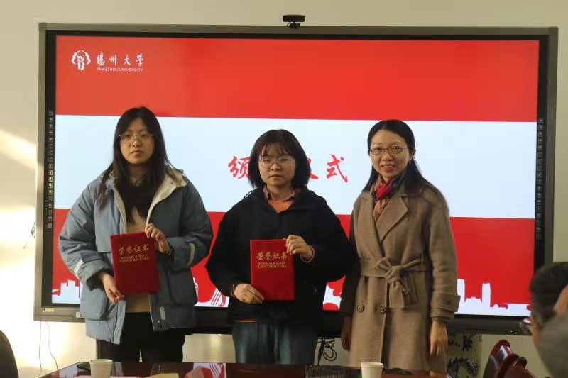 梁隆圣、顾霄勇、洪岑分别为获得扬杰励志奖学金的优秀学生颁发了获奖证书。