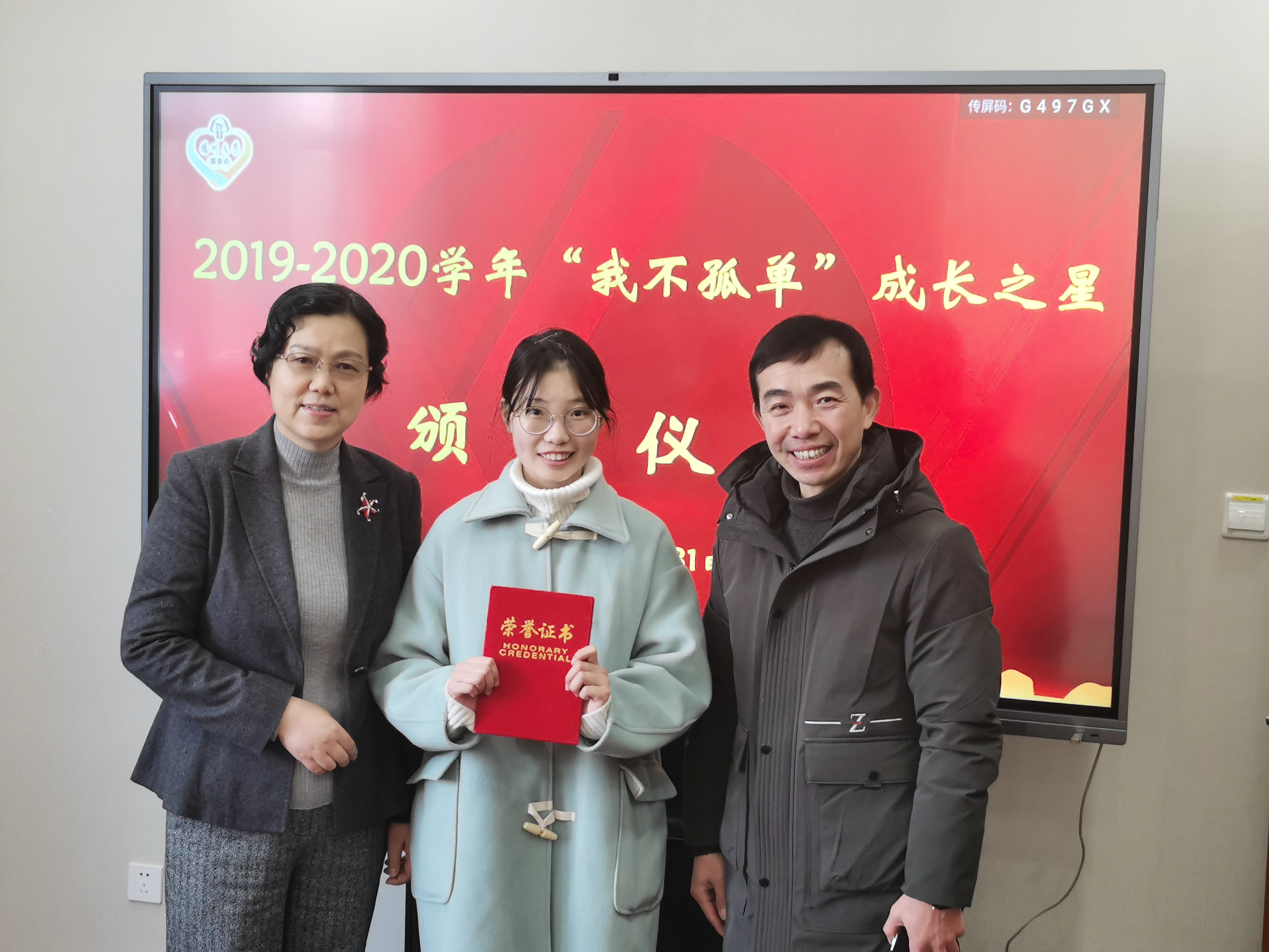 会上,经评审工作小组讨论,一致同意评选在科研方面取得优秀成绩的陈星宇同学和在实践方面获得成果的钱诗玥同学为“我不孤单”成长之星。