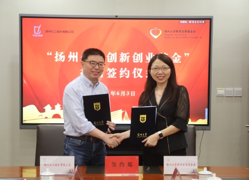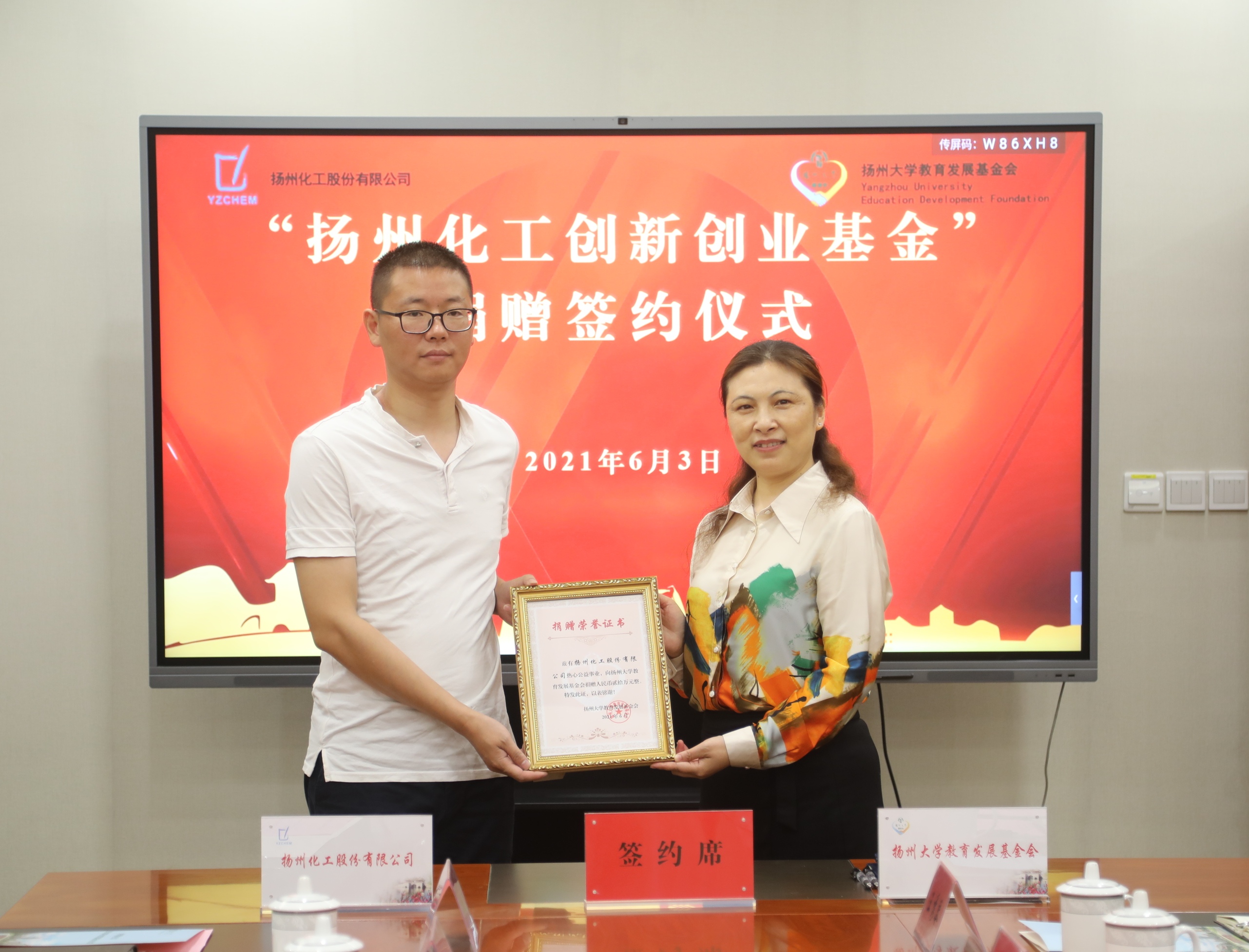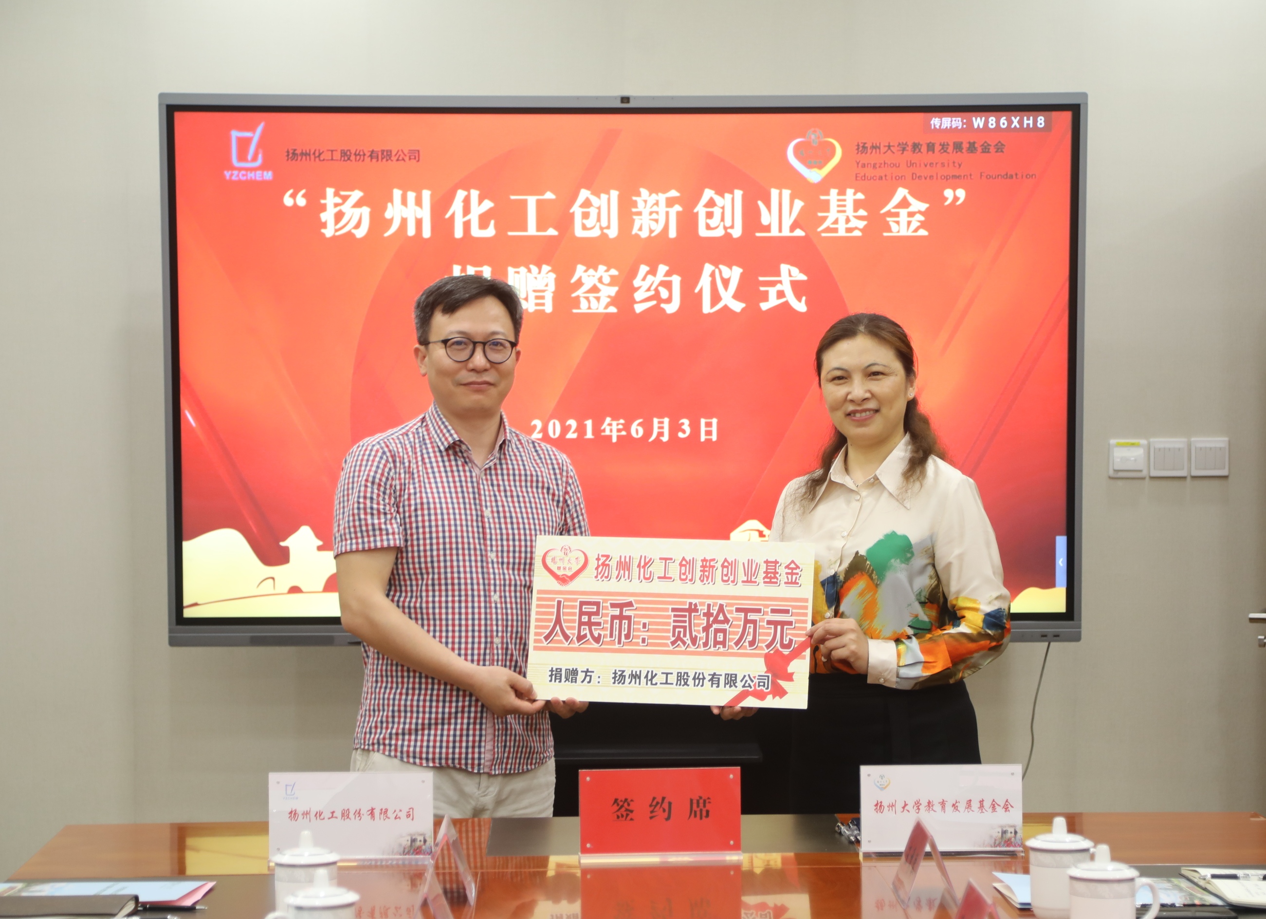 2021年6月3日,“扬州化工创新创业基金”捐赠签约仪式在校友馆二楼会议室举行。仪式由基金会秘书长洪岑主持。