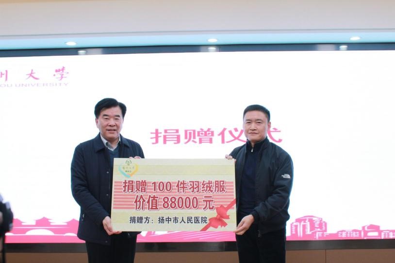 医学院院长史宏灿代表学院接受扬中市人民医院的捐赠物品——价值八万八千元的一百件某品牌羽绒服。
