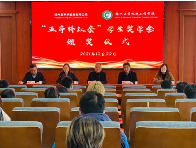 2021年12月22日,我校机械学院在力行楼401报告厅举办了“五亭桥缸套”学生奖学金颁奖仪式。我校校友、扬州五亭桥缸套有限公司质量总监许伟、技术中心副主任夏园,学院党委书记刘汉柏、副书记张平、副院长张超出席仪式。学院材料专业各年级本科生参加仪式。仪式由张平主持。