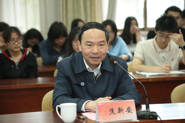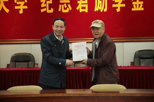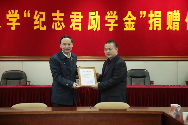 焦新安校长对纪志君校友在母校捐资100万元设立“纪志君励学金”表示衷心感谢。焦新安强调,一所大学要有大爱,有爱才能传承社会的责任和担当;要有梦想,大学的学习要为学生放飞梦想打好基础;要有精神,“坚苦自立”的校训精神是一种感召和养育;要有品味,要提高大学的办学水平,培养高素质人才。焦新安希望广大师生大力弘扬“坚苦自立”的校训精神,积极践行“厚德抱朴、弘道树人”的教风和“学之以恒、行之以德”的学风,奋勇拼搏,奋发进取;希望大家以广大校友为榜样,常怀感恩之心,常为感恩之行,带头践行社会主义核心价值观;希望大家积极传承扬大人爱校、荣校、兴校的光荣传统,进一步增强责任意识、担当意识、卓越意识,努力为学校向更高水平迈进作出更大贡献。