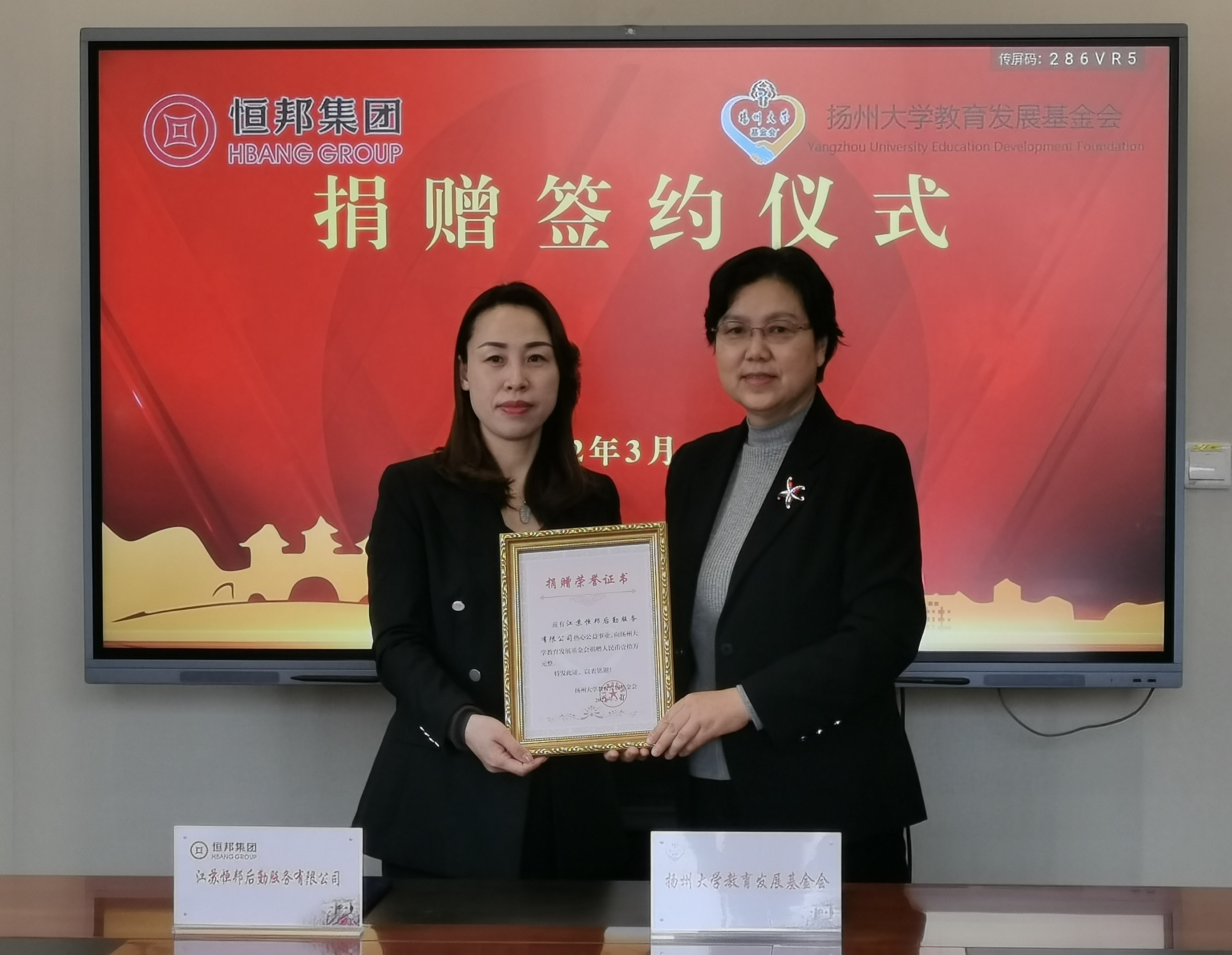 2022年3月10日,扬州大学教育发展基金会与恒邦集团举行捐赠签约仪式。扬州大学教育发展基金会理事长陈耀,恒邦集团常务副总王秋萍,扬州大学后勤保障处处长王恩军,扬州大学教育发展基金会副秘书长王秀琴,恒邦集团党支部书记石磊、工会主席贾兆君、办公室主任申瑶等参加活动,仪式由扬州大学教育发展基金会秘书长洪岑主持。