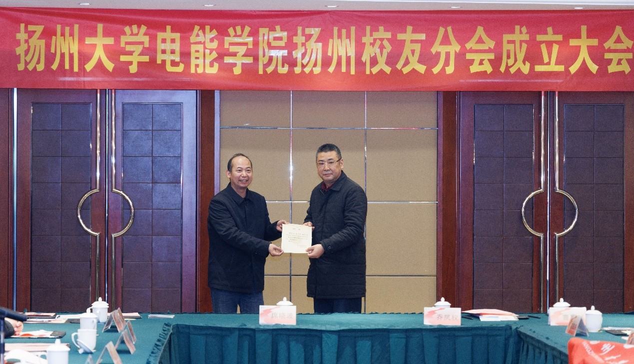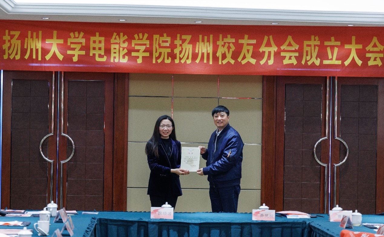 洪岑和学院党政领导班子为电能学院扬州校友分会理事会成员颁发聘书。