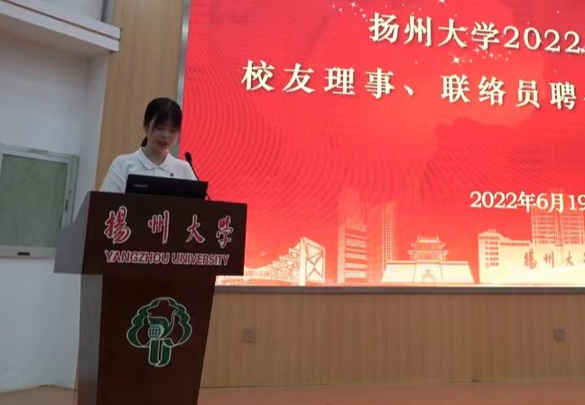 2022届毕业生校友理事会理事长许一旦发言,她表示,将同心同德做好“接力者”,凝心聚力当好“联络员”,开拓创新答好“扬大卷”,推进2022届毕业生校友理事会工作开创新局面、谱写新篇章。